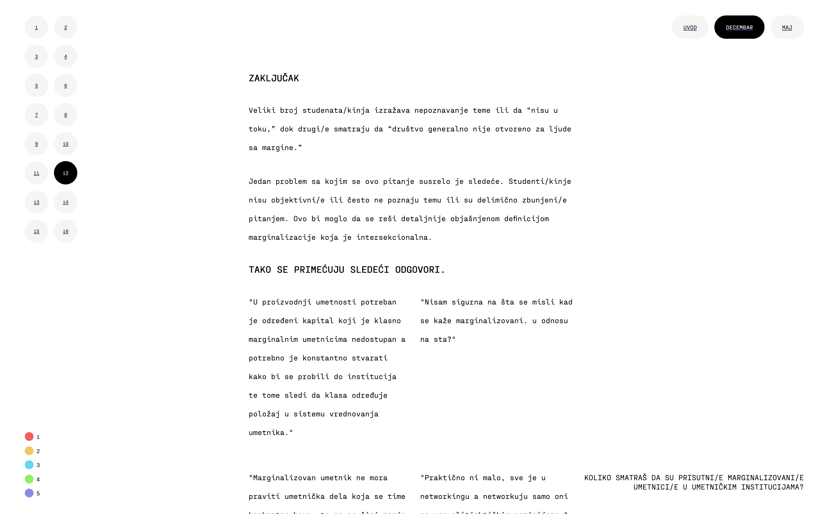 The research is presented in a digital form through an interactive infographic which consists of the collected data, with an emphasis on the key explanations received from the responders, as well as video recordings of the “dialogues” with cultural workers, which work as a summary and an interpretation of the key findings.